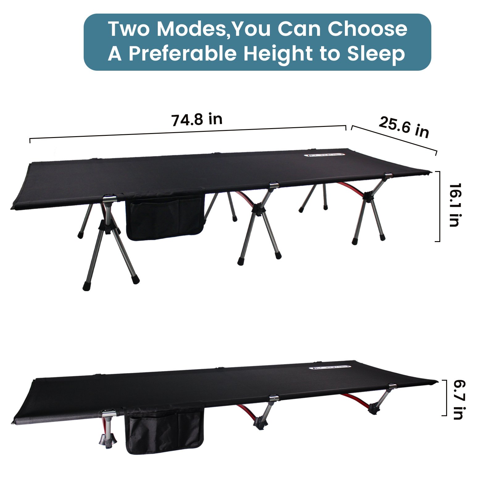 • There are two Height Modes: high bed mode and low bed mode for your convenience. This cot can be converted from 7" to 15" in height. You can choose a preferred height to sleep at, keeping you off the cold ground and away from bugs.
